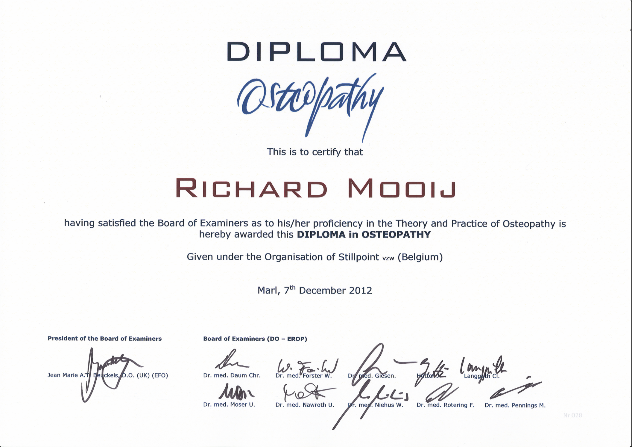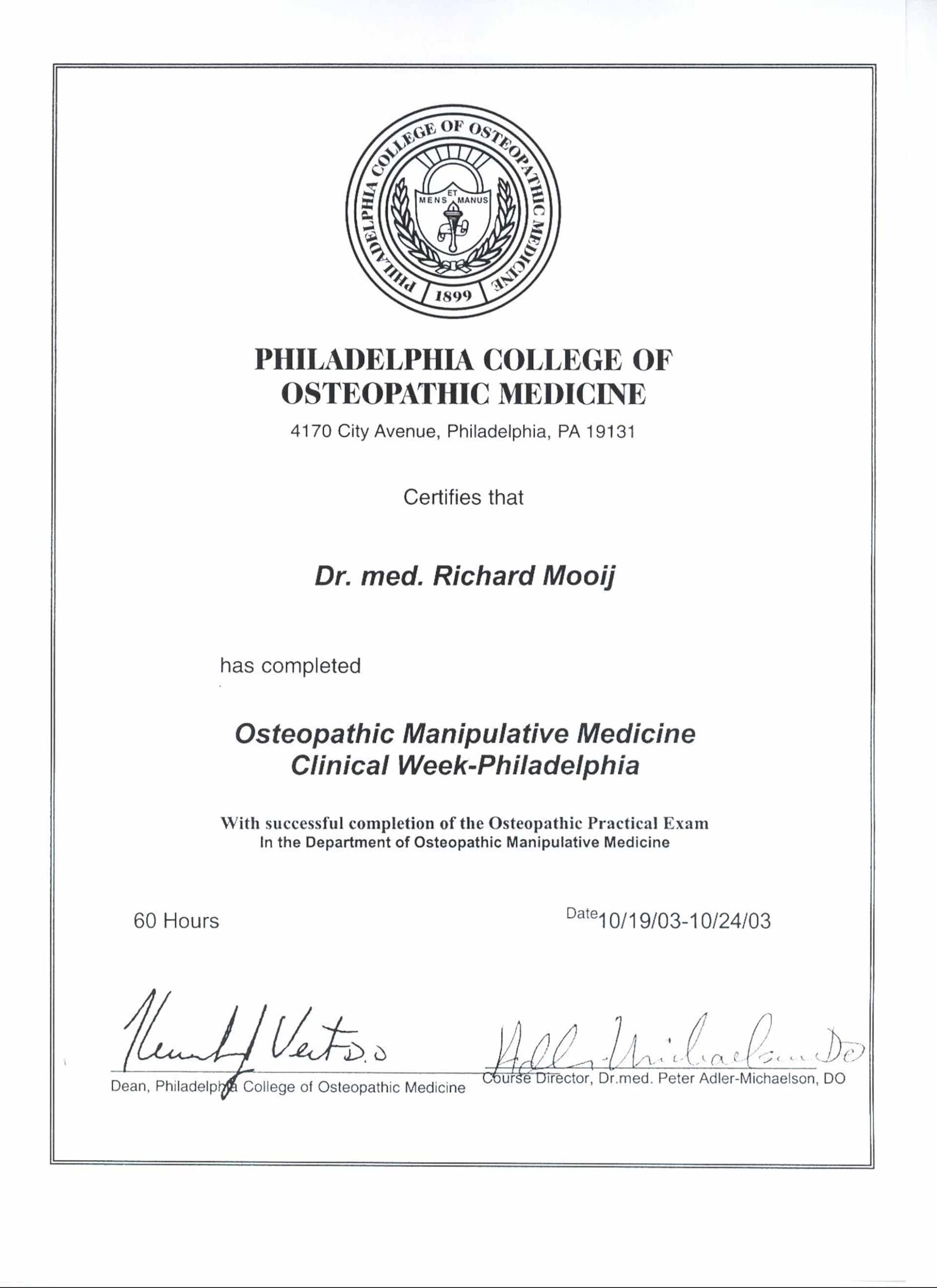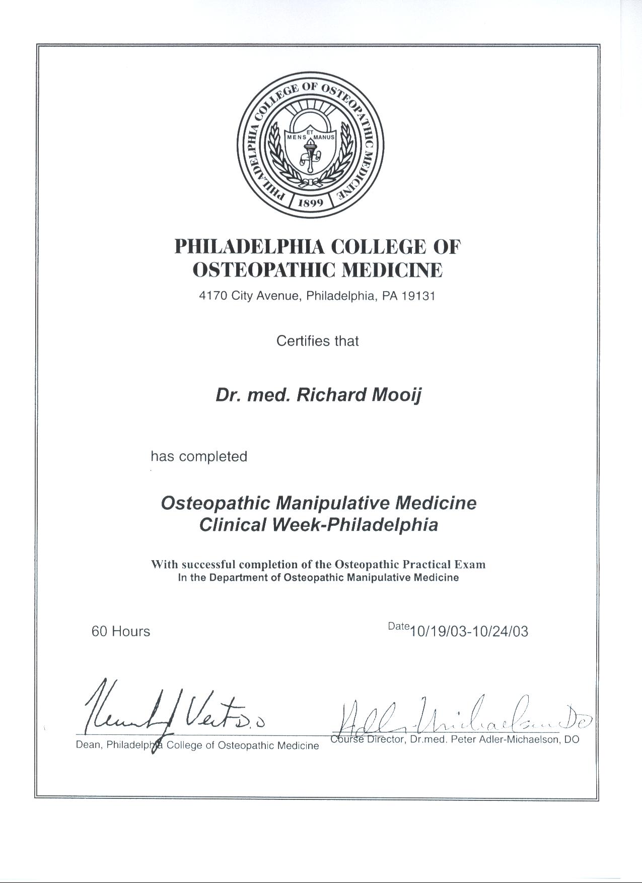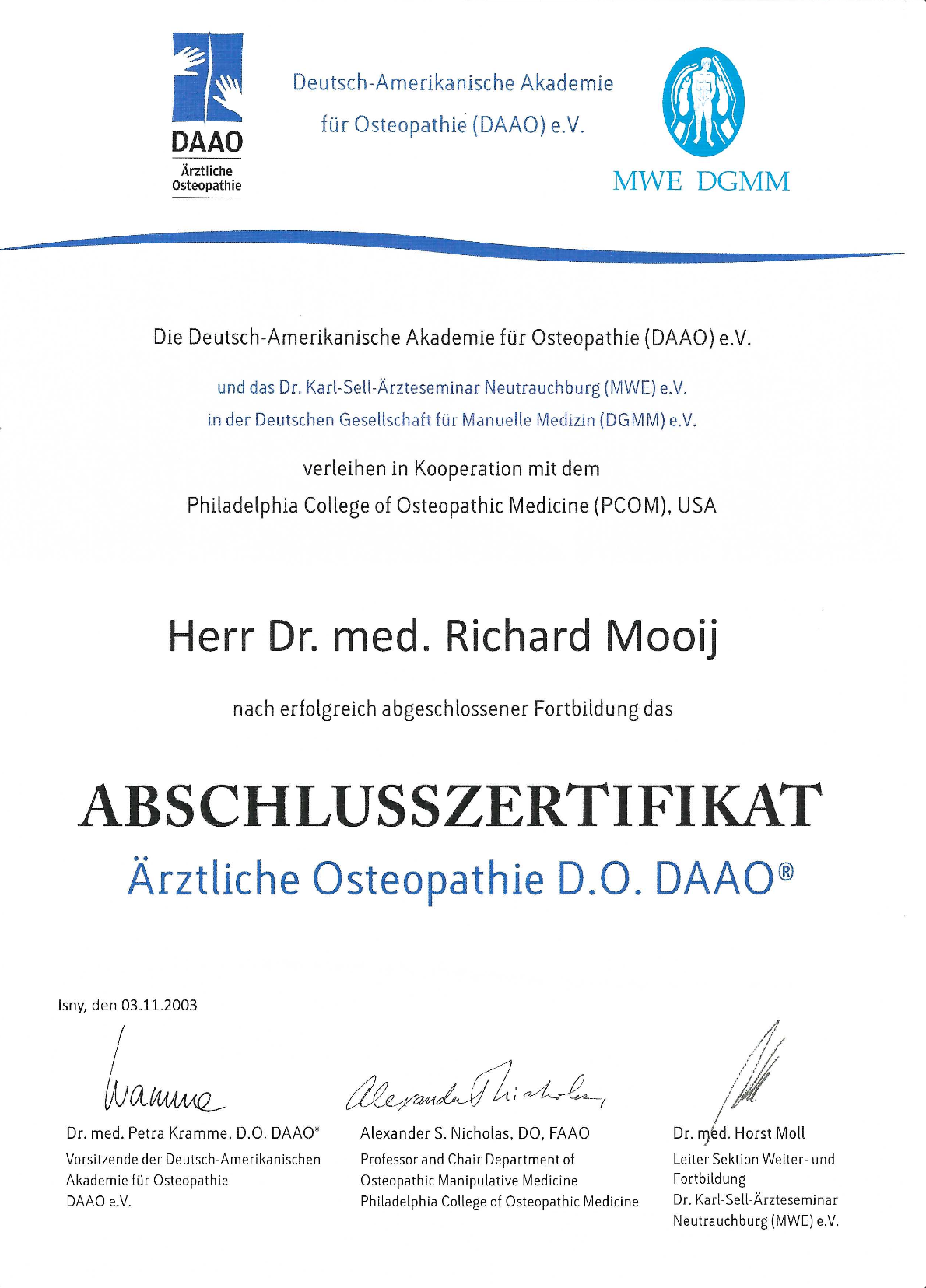 Auch in der Osteopathischen Medizin nehme ich regelmäßig an Weiterqualifikationen teil. In 2003 erwarb ich das Zertifikat und das Diplom in Osteopathischer Medizin bei der DAAO in Kooperation mit dem Philadelphia College of Osteopathic Medicine (PCOM). Als Mitglied der European Register of Osteopathic Physicians (EROP) erlangte ich dasDiplom nach den hohen Qualitätsstandards der EROP 2010.