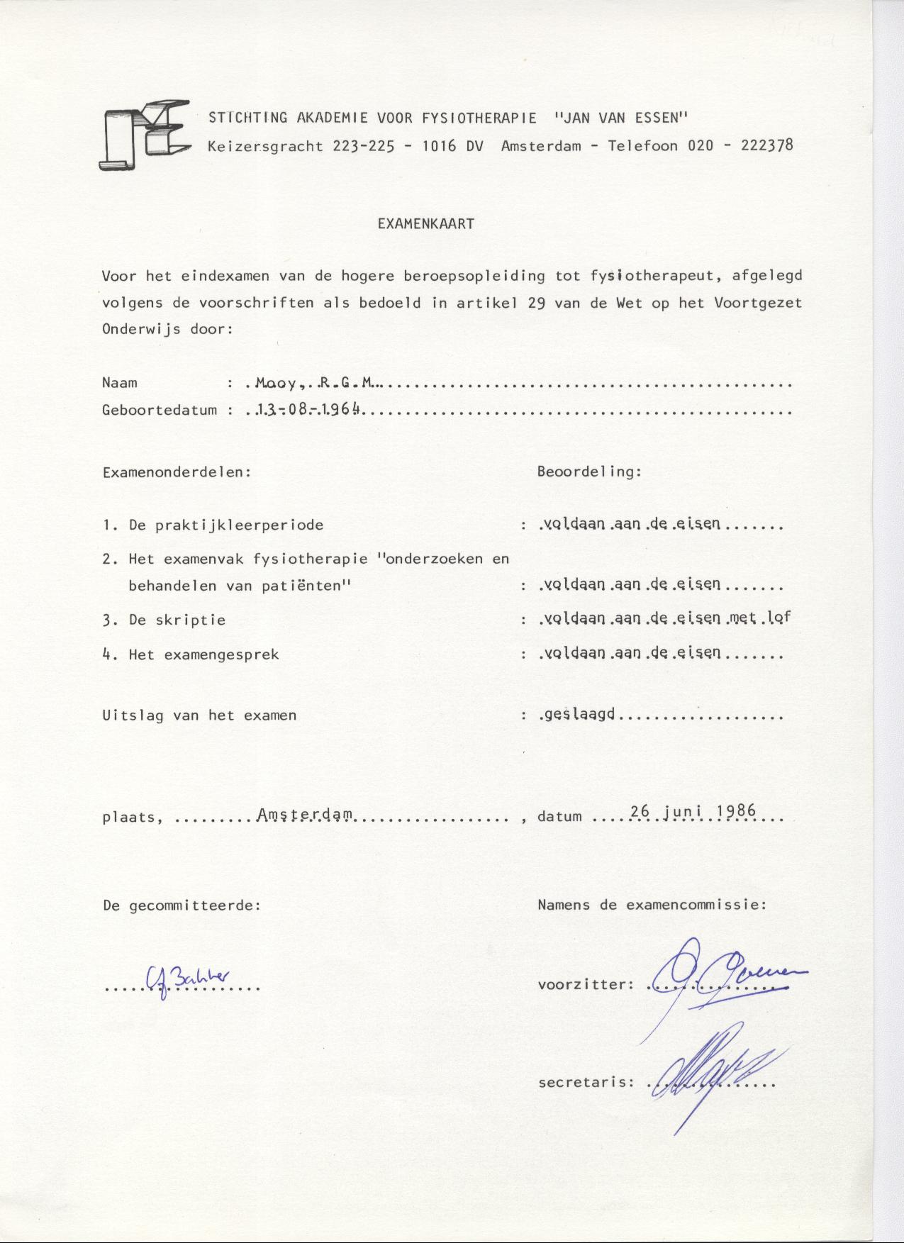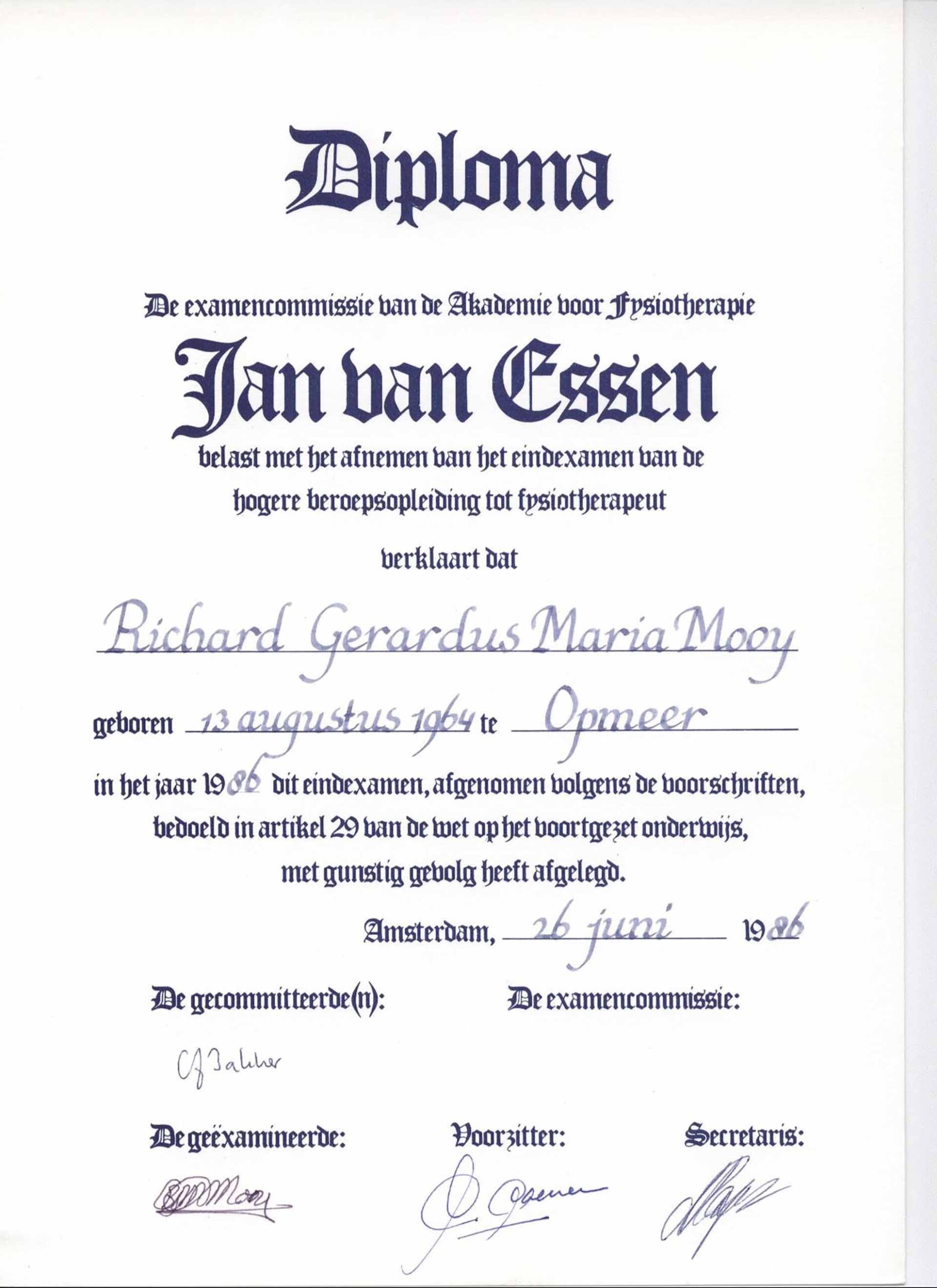 Das Studium der Physiotherapie absolvierte er von 1982 bis 1986 an der Fachhochschule Jan van Essen in Amsterdam mit dem Bachelor of Science (BSc). Anschließend war er unter anderem im Militair Revalidatie Centrum in Doorn sowie in verschiedenen Praxen in den Niederlanden und Deutschland tätig. Es folgten zahlreiche Weiterbildungen, darunter Sportphysiotherapie, dreidimensionale Skoliosetherapie nach Katharina Schroth und Traditionelle Chinesische Medizin, die er in Europa und China erlernte.