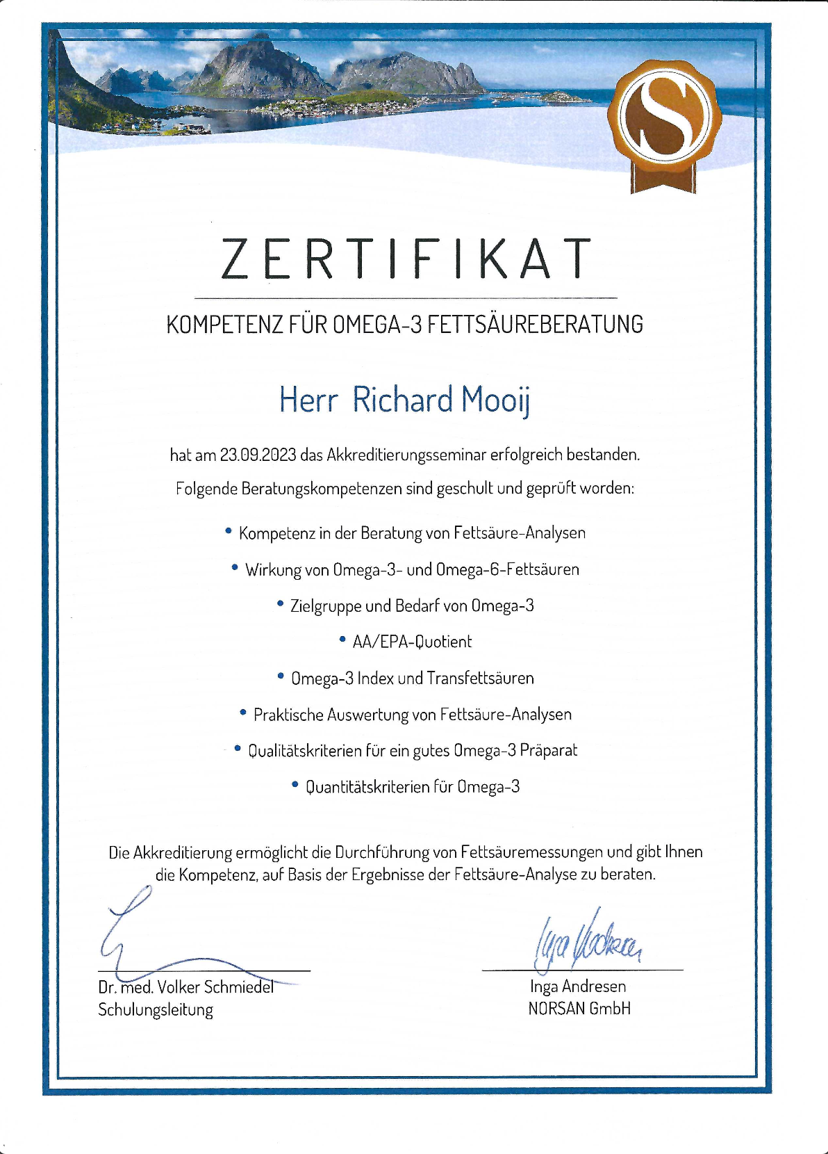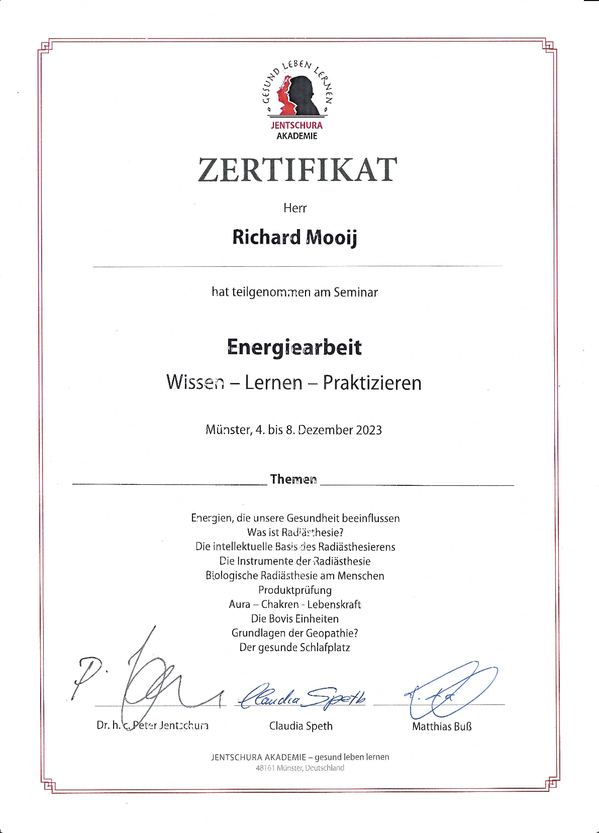 Seit dem Sommer 2023 habe ich mehrere Fortbildungen in der Mikronährstoffmedizin absolviert und nehme regelmäßig an Seminaren (Münster, Hannover, Hamburg) und Online-Seminaren teil. Eine Fortbildung zu Omega-3-Fettsäuren und Fettsäurenanalyse wurde von mir 2023 absolviert. Im Dezember 2023 konnte ich zudem eine 5-tägige Fortbildung über „Energiearbeit“ an der Jentschura-Akademie in Münster abschließen.