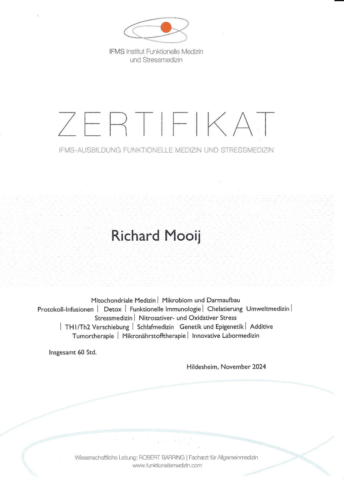 Unter der Leitung von Dr. Robert Barring erhielt ich 2024 das Zertifikat vom IFMS (Institut Funktionelle Medizin und Stressmedizin) im MasterClass in Österreich. Meine Mitarbeiterin Frau Stanojevic und ich konnten das Kompetenzseminar für Praxispersonal, organisiert vom IFMS, in Hildesheim ebenfalls erfolgreich absolvieren. Auch einige Kompetenzseminare des IFMS wurden von mir belegt, wie Genetik I in Frankfurt 2024, Genetik II in Würzburg 2025 und Mikrobiom in Limburg an der Lahn 2025.