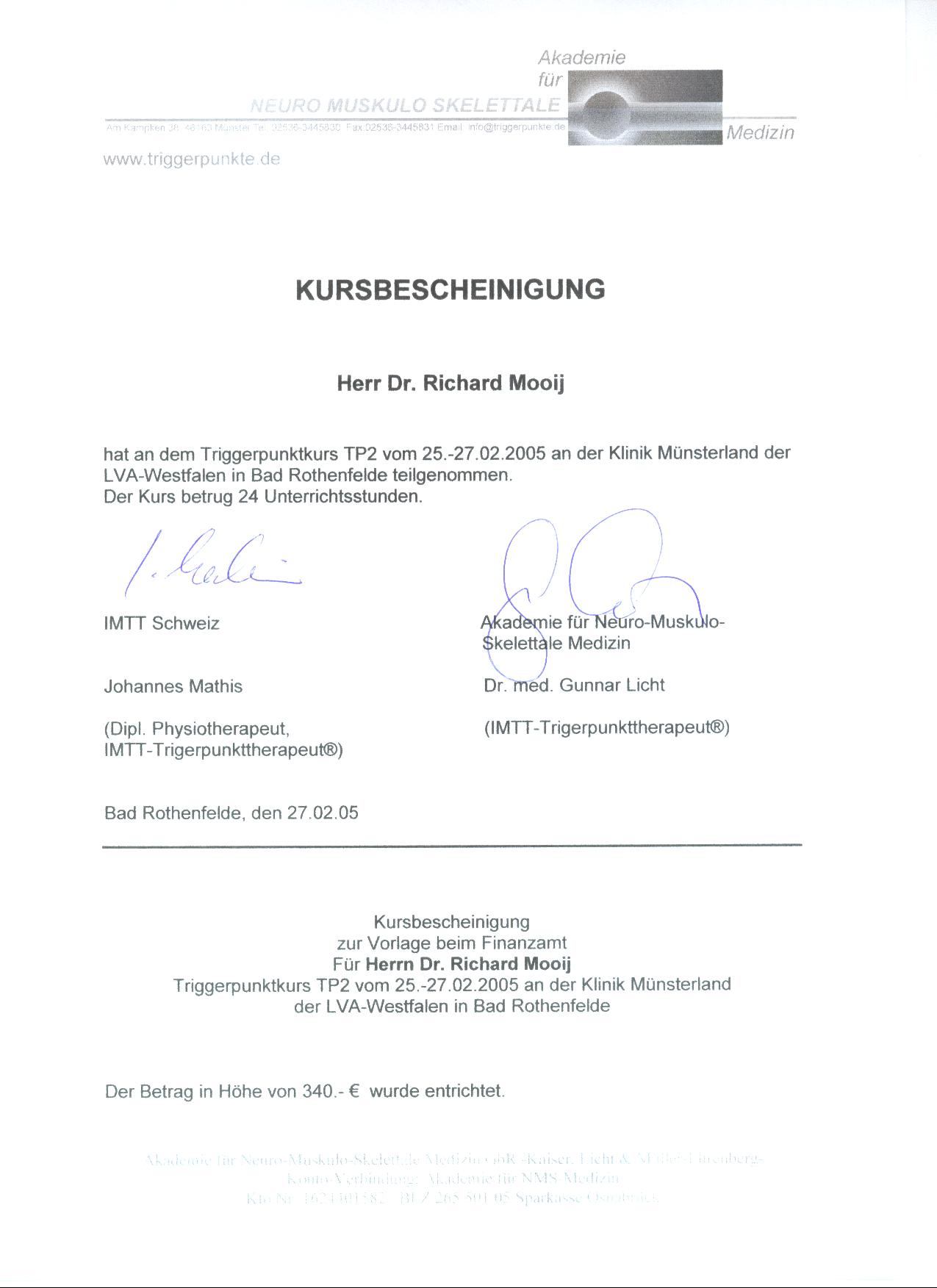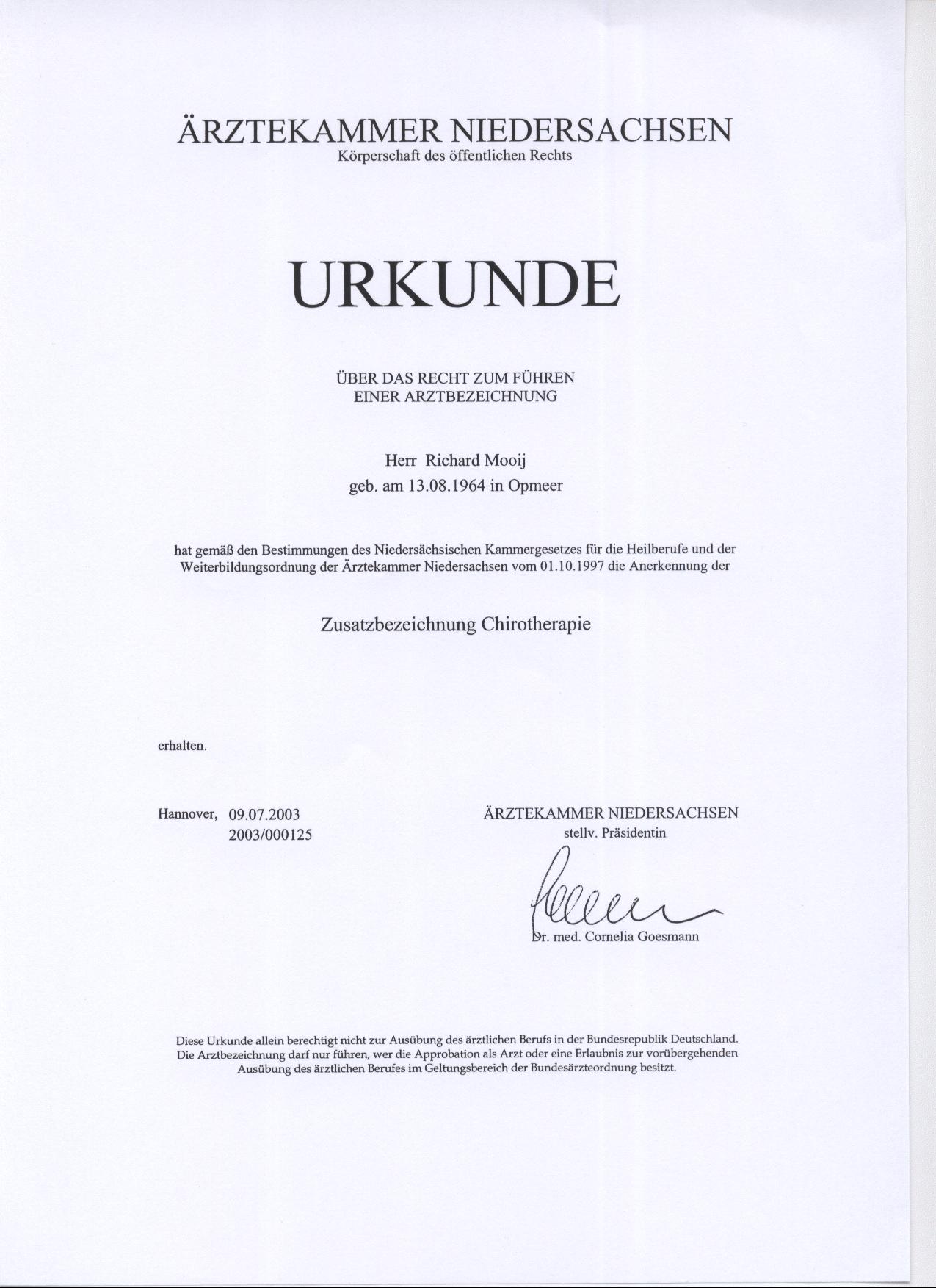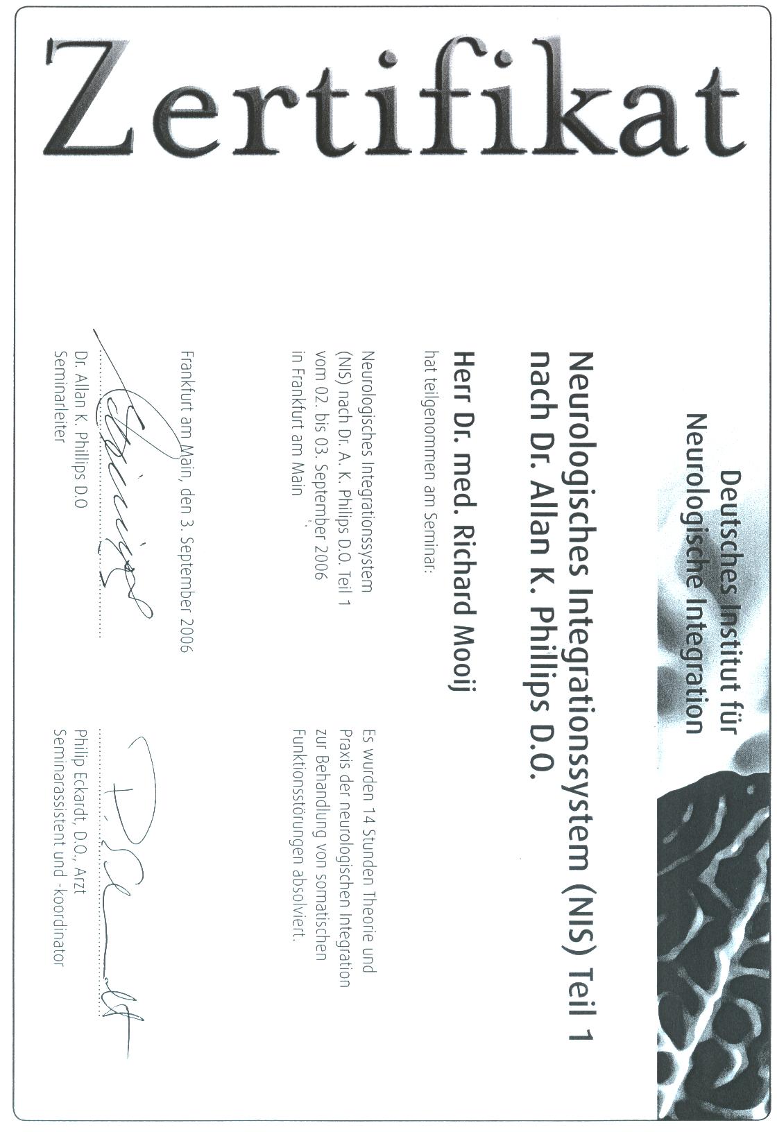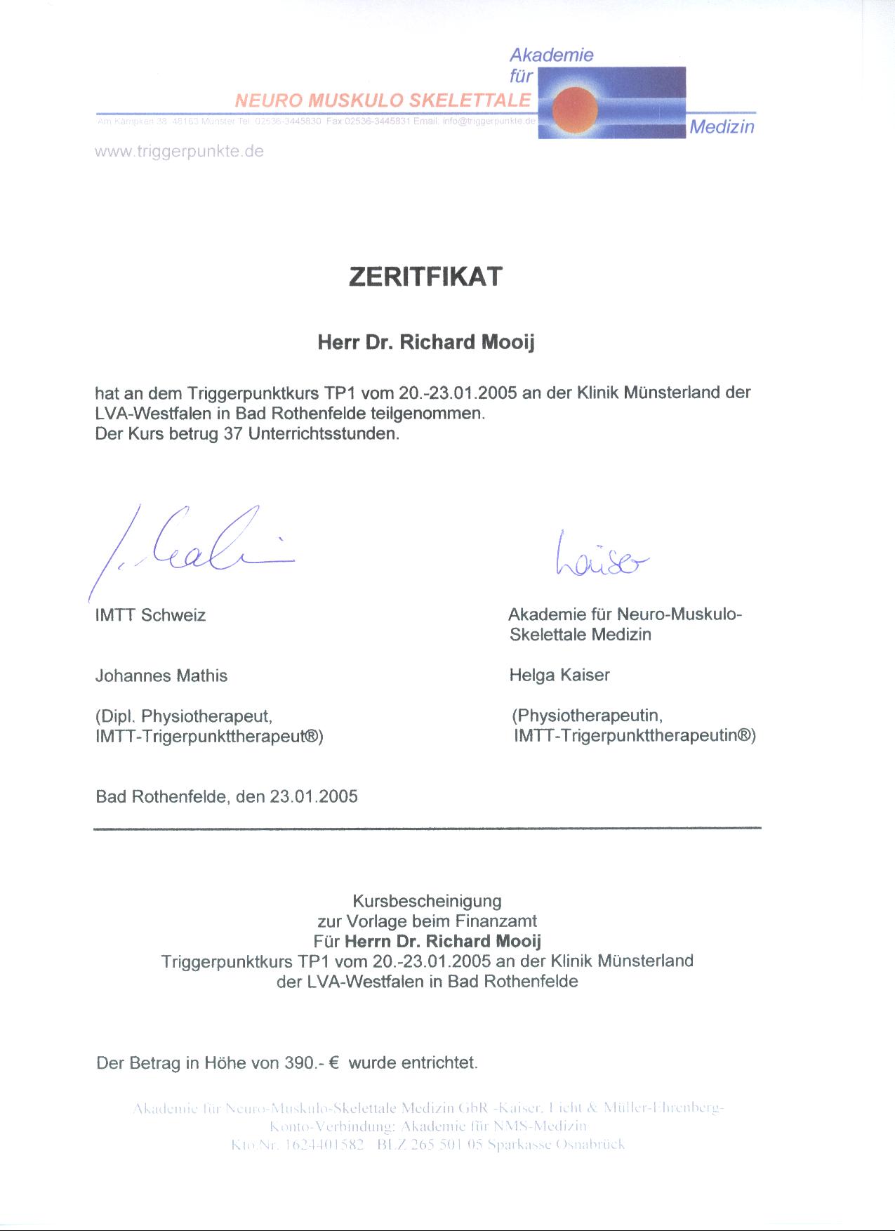 In 2003 erlangte ich die Zusatzbezeichnung Chirotherapie im Ärzteseminar Manuelle Medizin (MWE) bei der Deutschen Gesellschaft für Manuelle Medizin (DGMM). In 2005 erlangte ich das Zertifikat Triggerpunkt Therapie bei der Akademie für Neuro-Muskulo-Skelettale Medizin. Das Zertifikat Matrix Rhythmus Therapie nach Randoll erlangte ich in 2007.