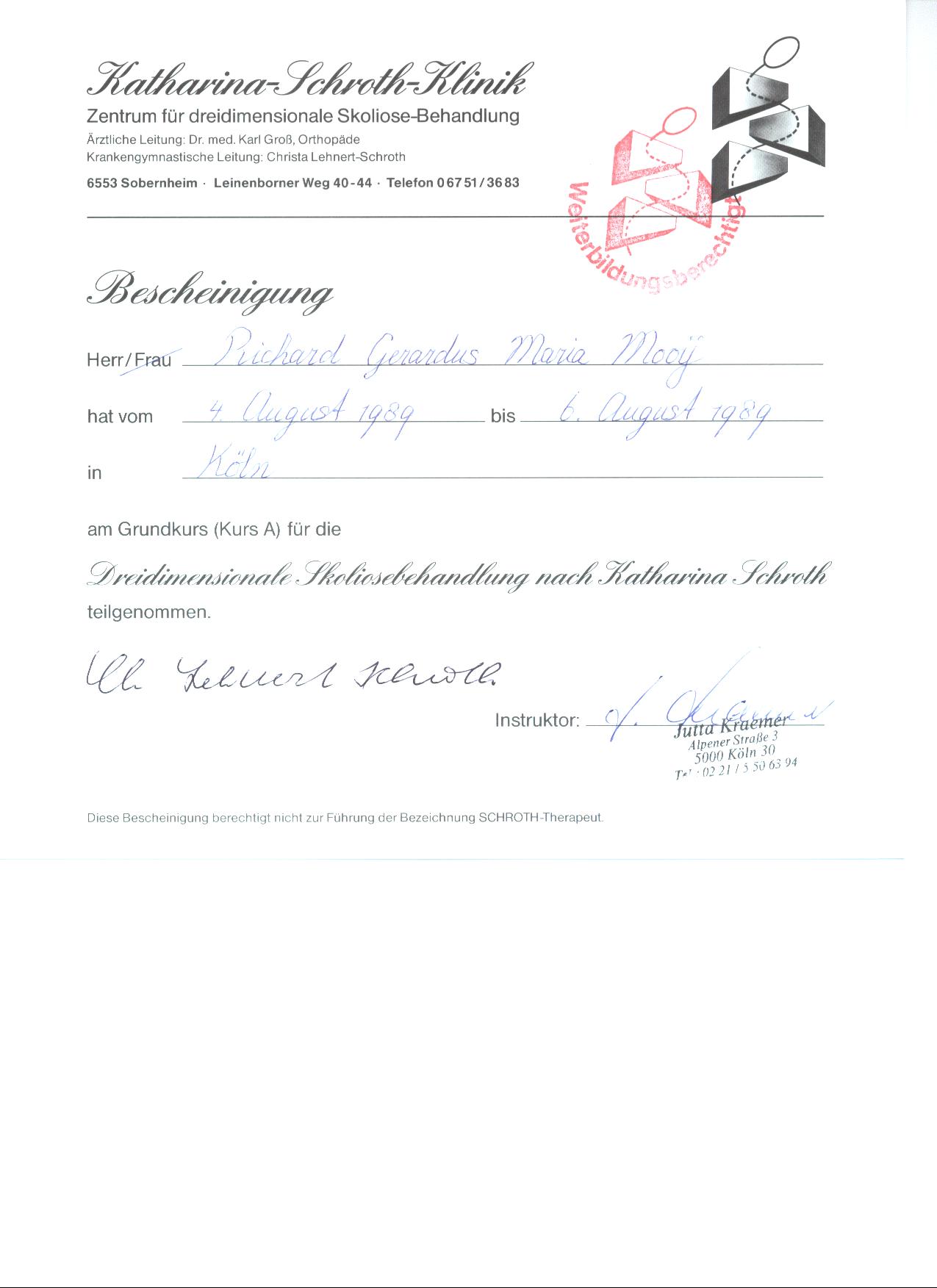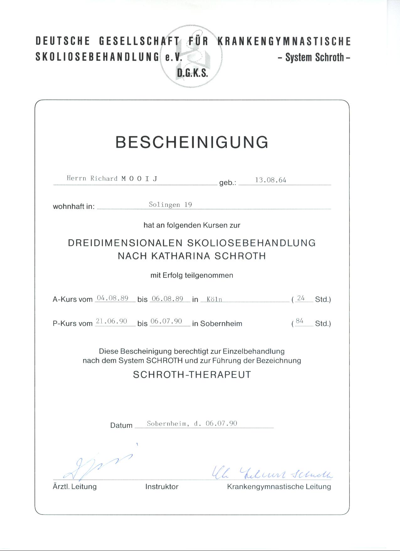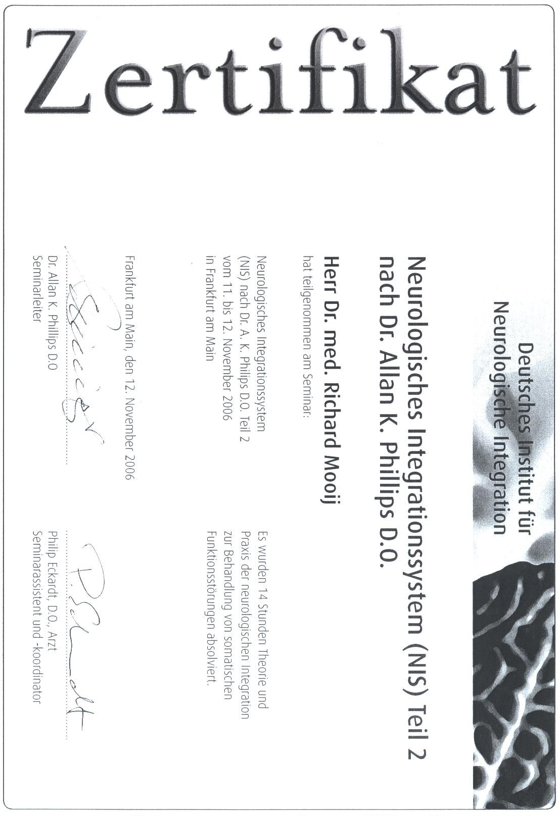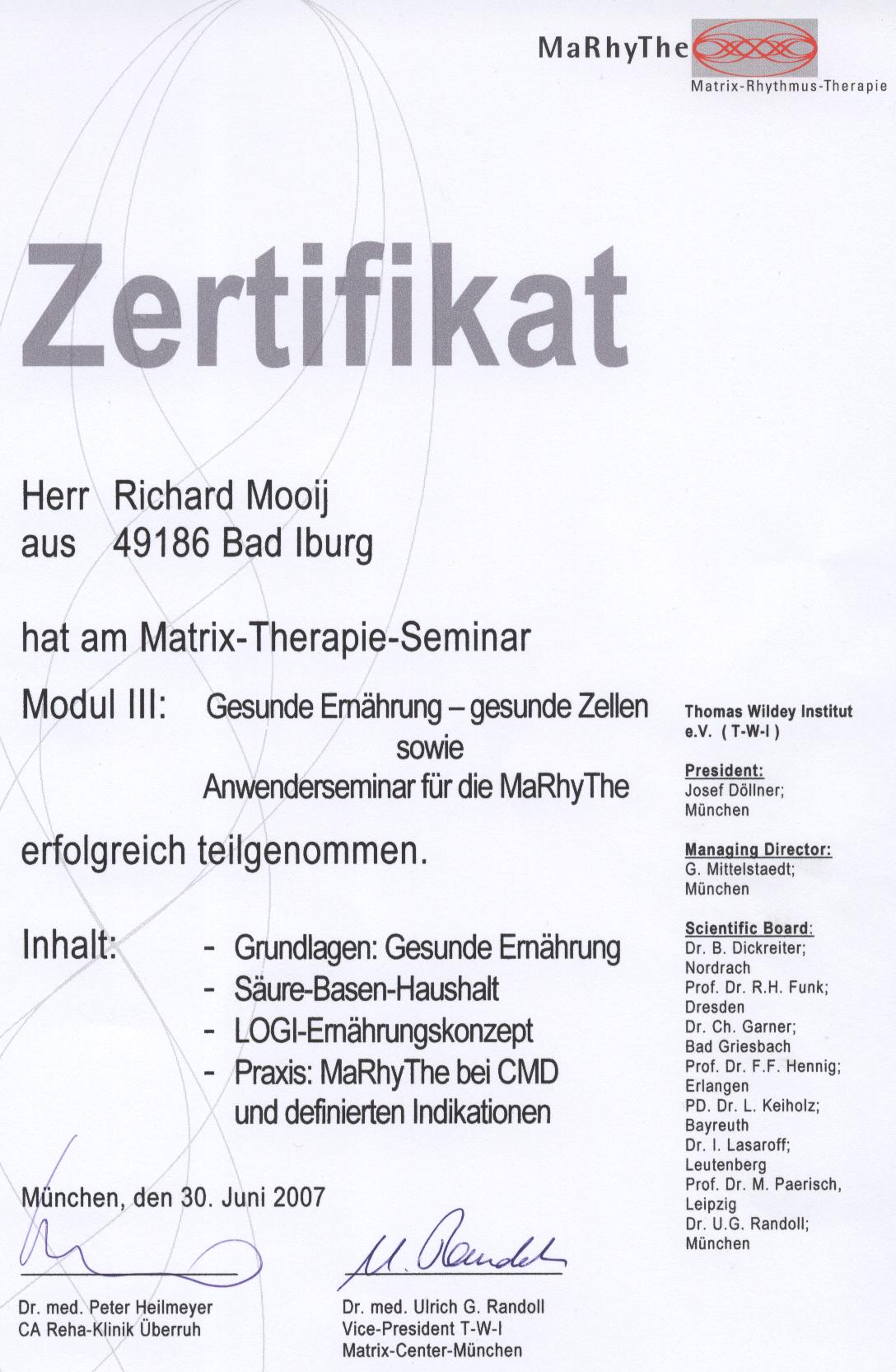 In 2003 erlangte ich die Zusatzbezeichnung Chirotherapie im Ärzteseminar Manuelle Medizin (MWE) bei der Deutschen Gesellschaft für Manuelle Medizin (DGMM). In 2005 erlangte ich das Zertifikat Triggerpunkt Therapie bei der Akademie für Neuro-Muskulo-Skelettale Medizin. Das Zertifikat Matrix Rhythmus Therapie nach Randoll erlangte ich in 2007.